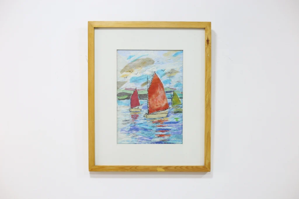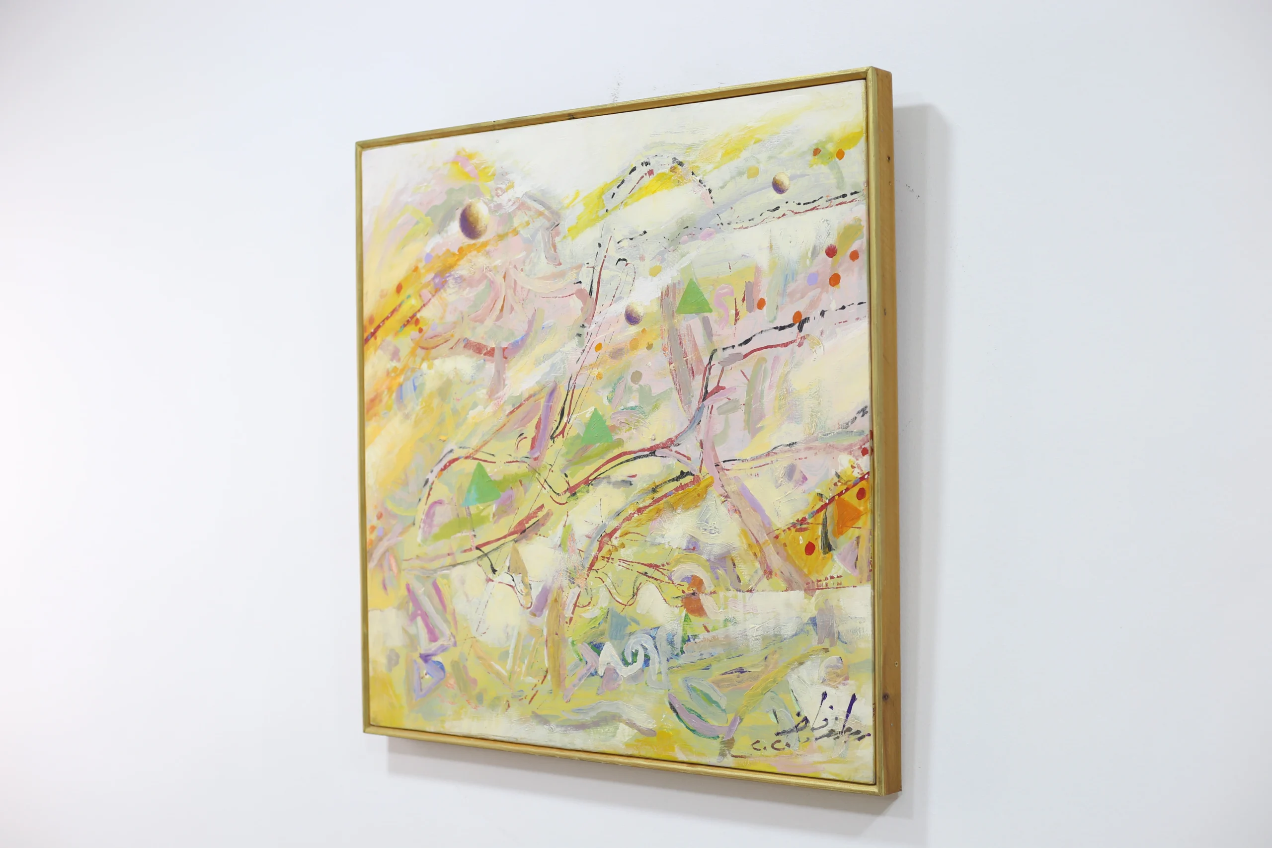 An original, signed abstract painting characterized by its energetic composition and bright, luminous palette. Swirls of yellow, gold, pink, and pastel tones create a dynamic piece that adds instant contemporary flair and light to any wall.