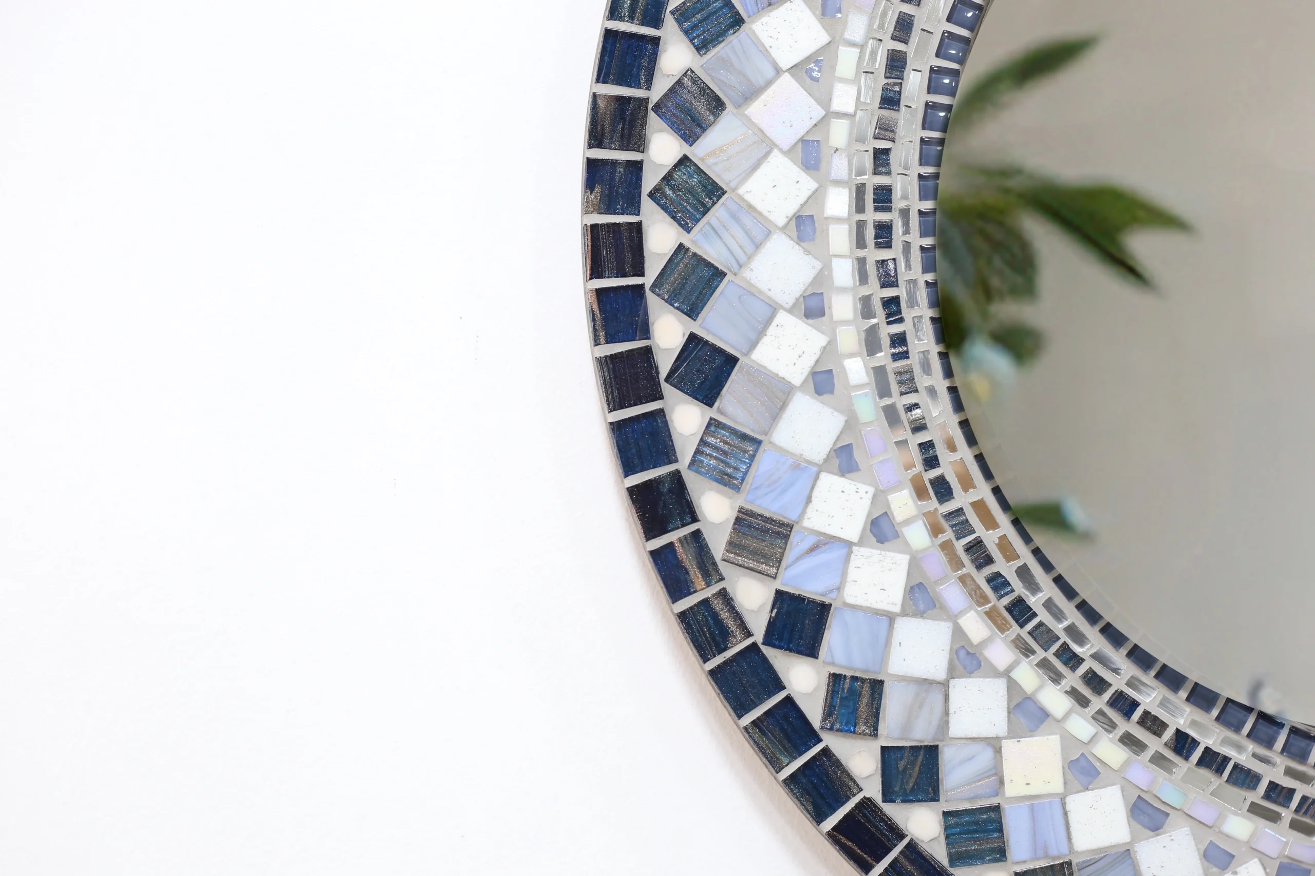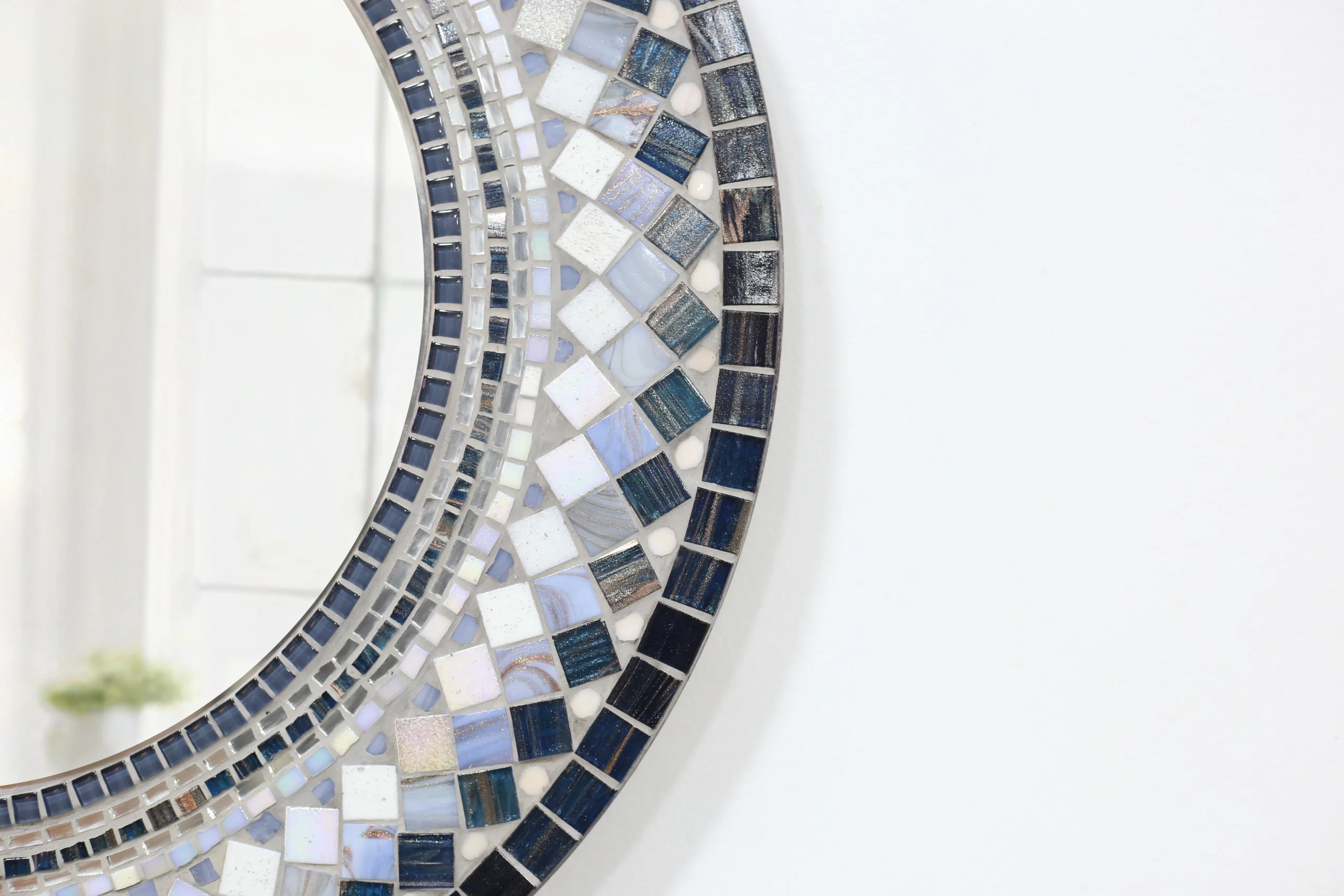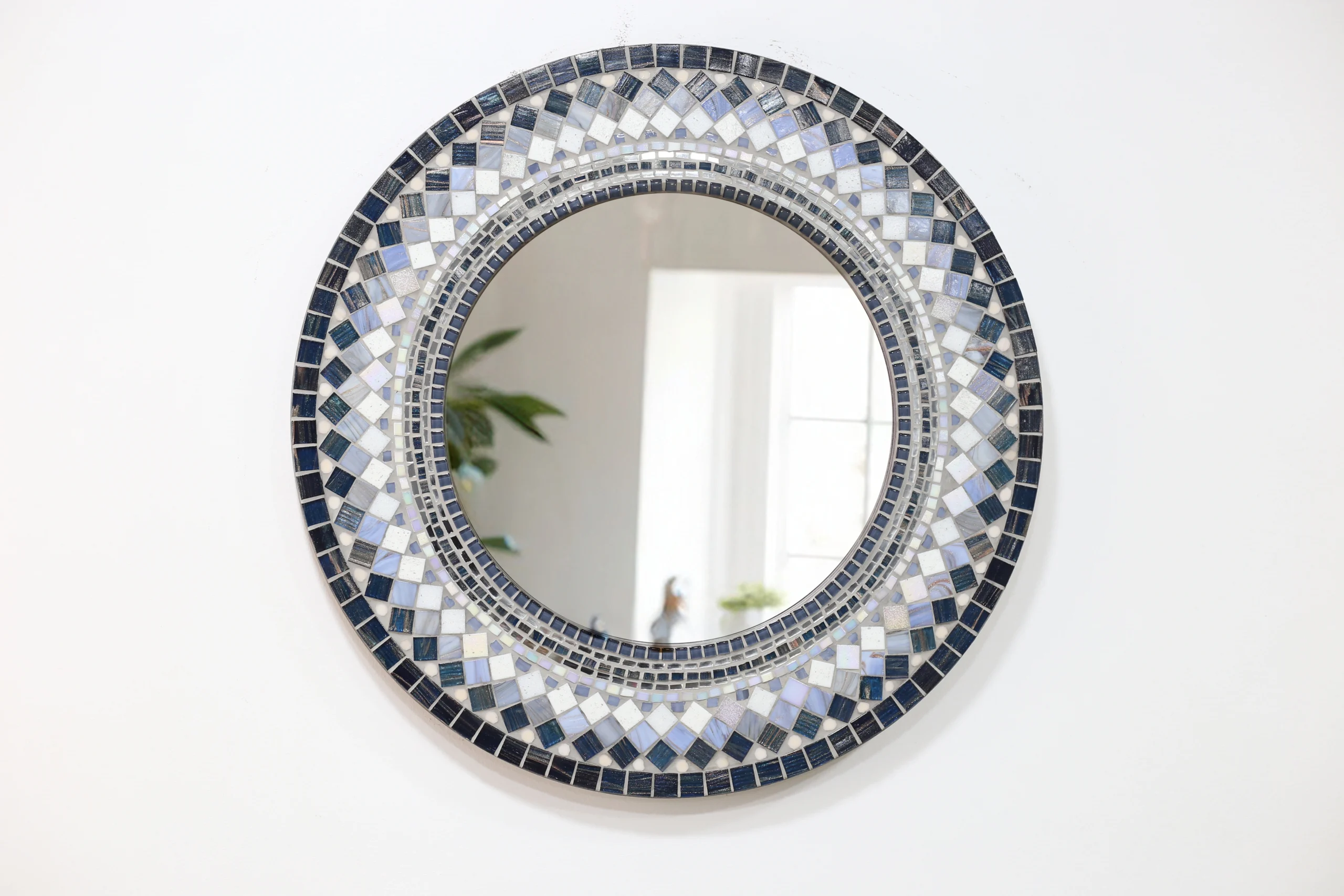Geometric Checkered Round Mosaic Mirror (Blue & White Tones)